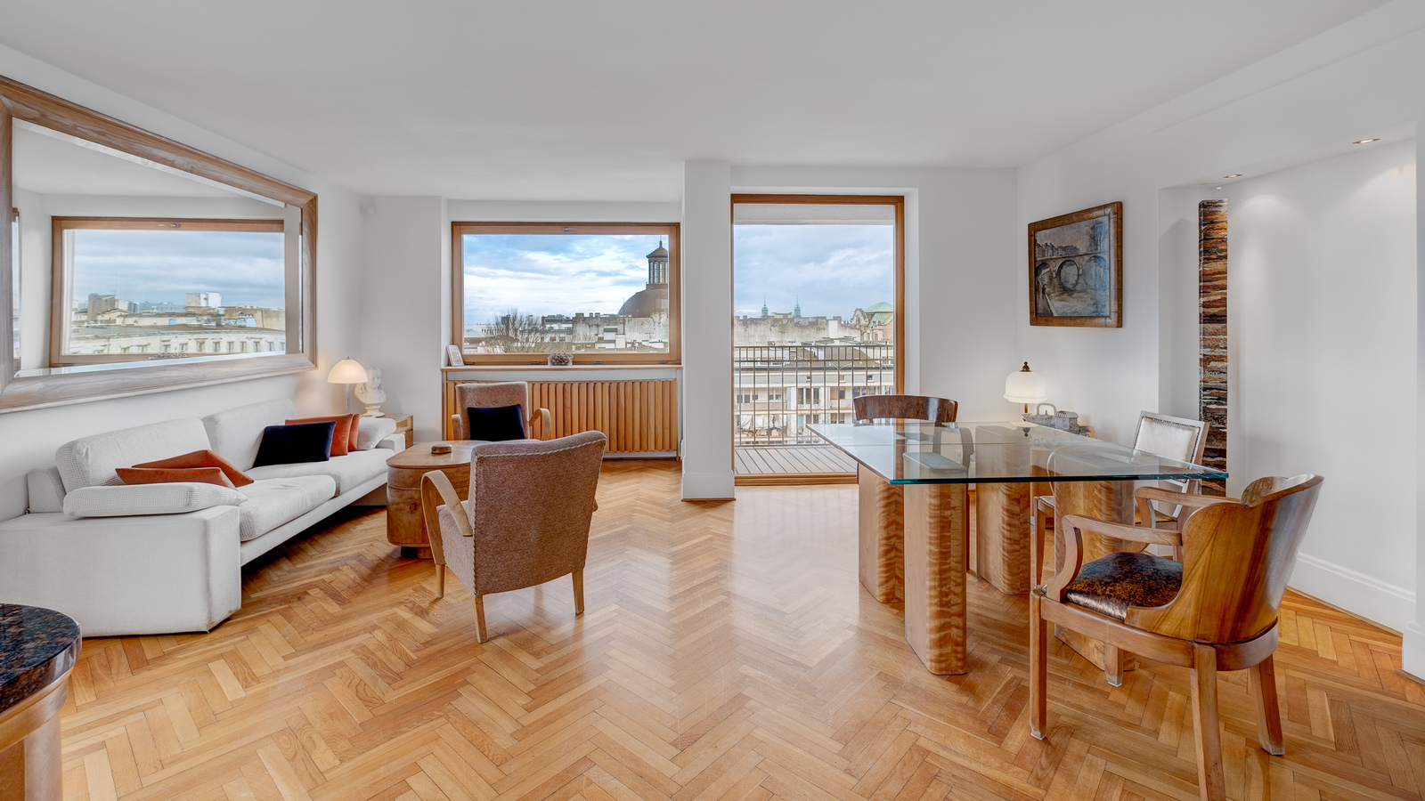 We present to you an exceptional flat for sale in the heart of Warsaw's Downtown. The flat is located on the 8th floor of a building on Dabrowski Square. The building dates back to 1962, but the flat is absolutely unique. It has a fantastic view of the impressive skyscrapers of the capital from one side, the dome of the evangelical church from the next, but the most beautiful view is from the living room straight to the Saxon Garden and the National Opera House visible in the distance.