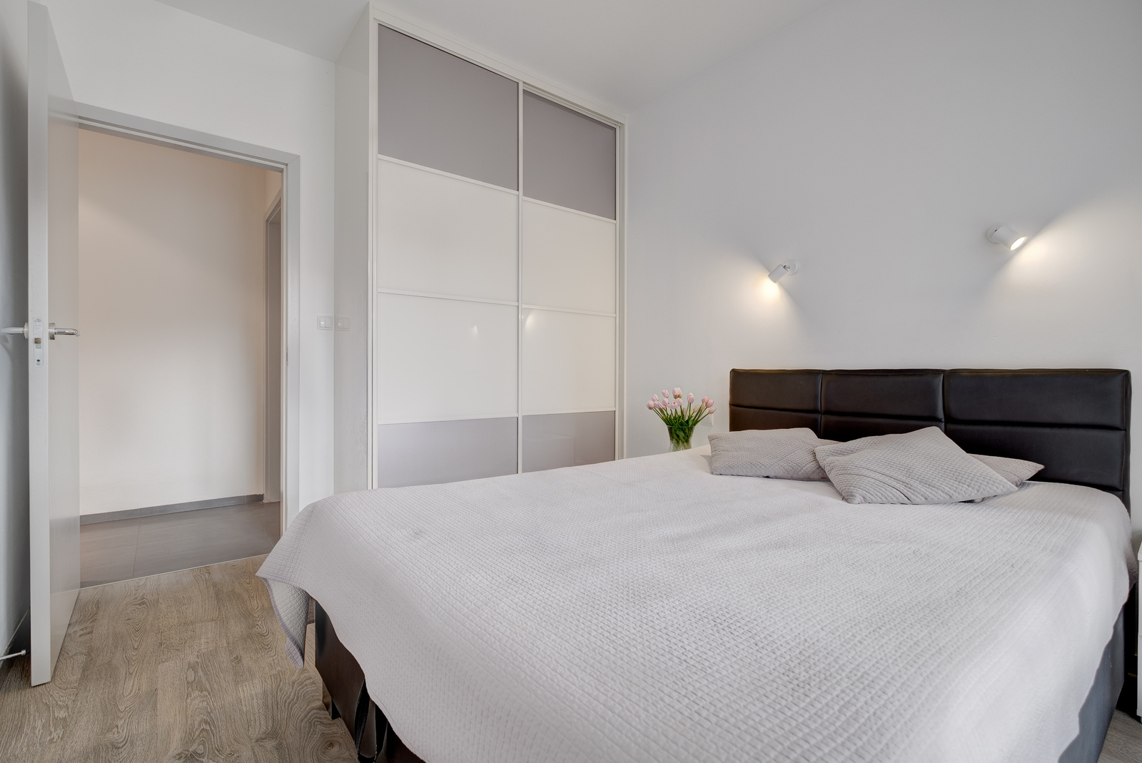 * bedroom with large bed and built-in wardrobes and exit to loggia