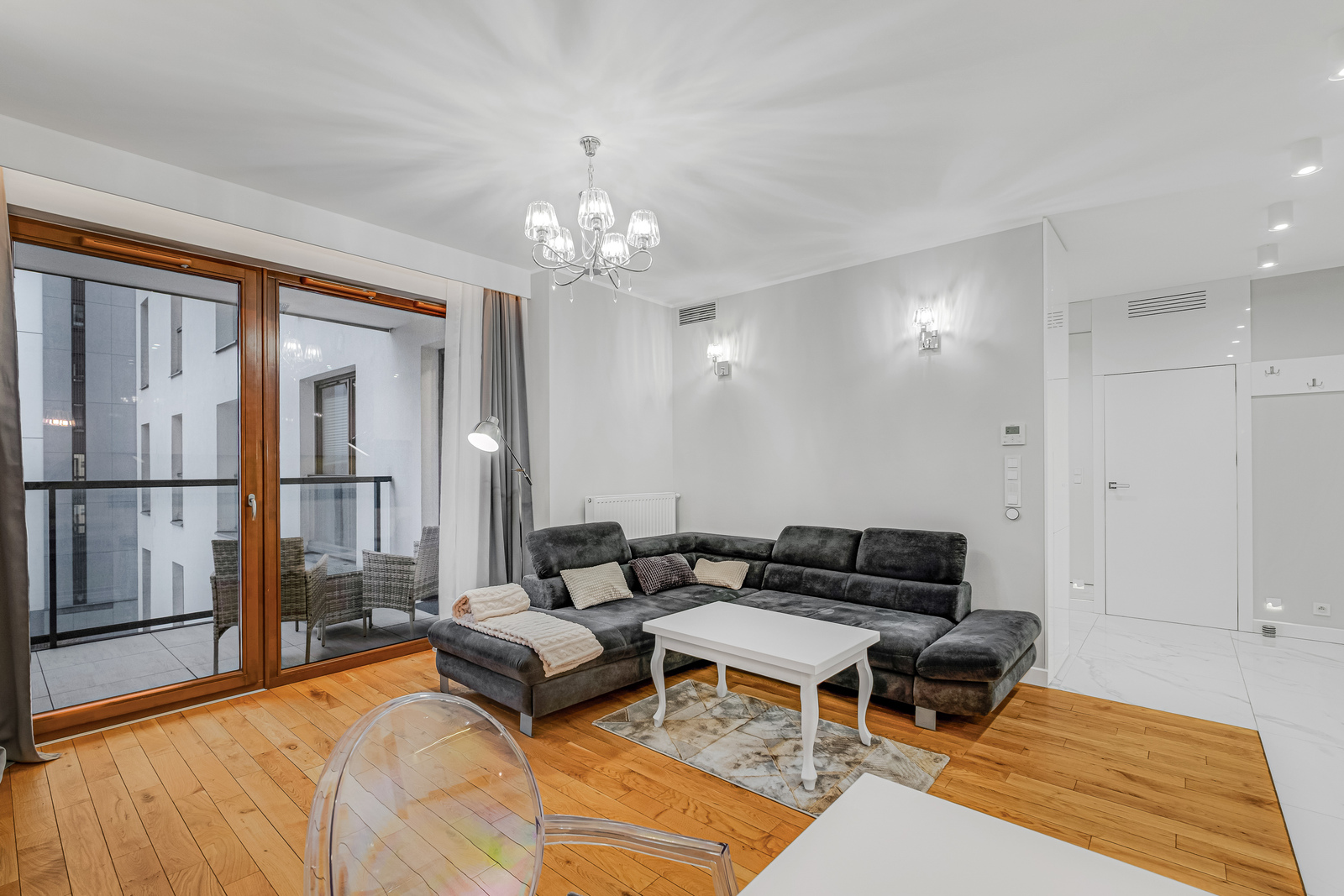 * Salonu z wyjściem na loggię (widok na patio) oraz aneksu kuchennego