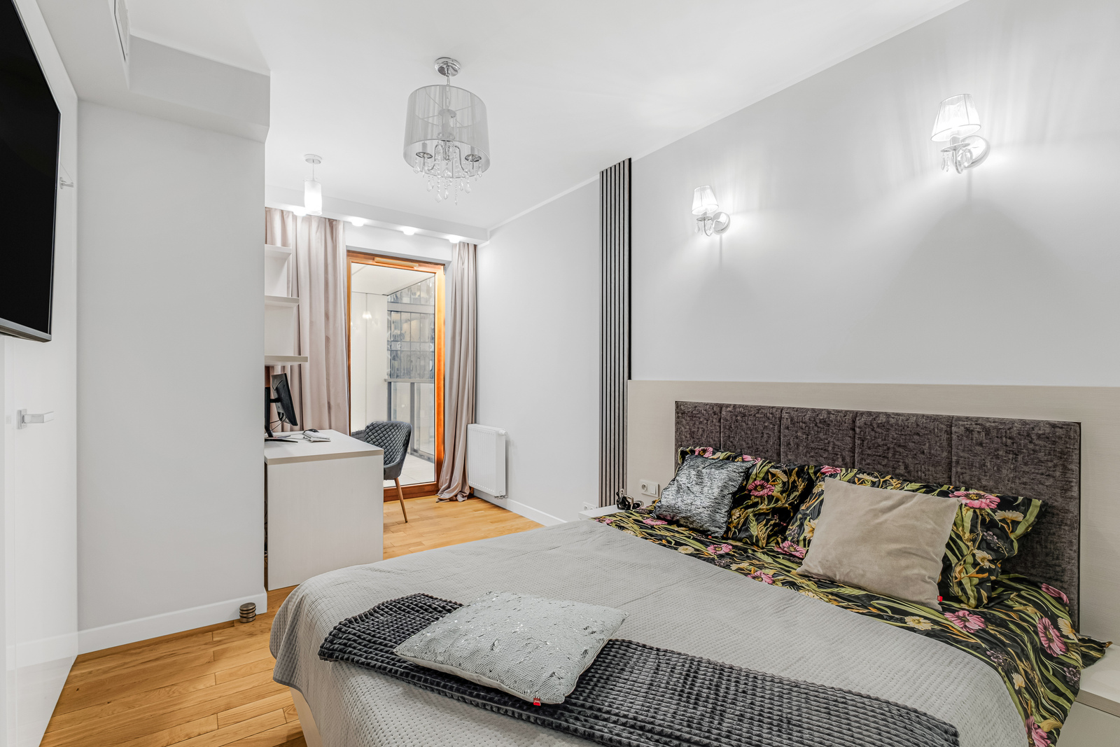 * Sypialni z dużym łóżkiem i bardzo dużą zabudowaną szafą oraz wyjściem na balkon