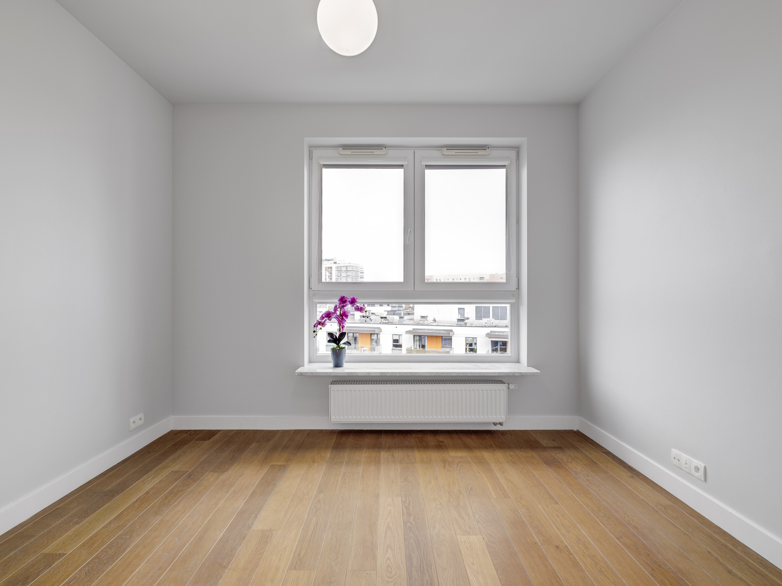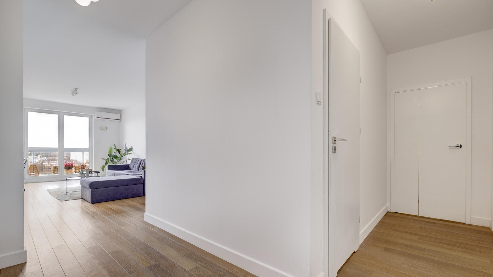 Powierzchnia 106 m2 obejmuje przestronny salon dzienny połączony z kuchnią z wyjściem na taras, z którego rozpościera się niezwykła panorama na zadrzewione ogródki działkowe, Stadion Narodowy i lewobrzeżną Warszawę. Obok salonu mieści się jedna z trzech sypialni, przestronna garderoba oraz łazienka z prysznicem. Na część prywatną apartamentu składają się dwie sypialnie, duża łazienka z wanną, garderoba z miejscem na pralkę.