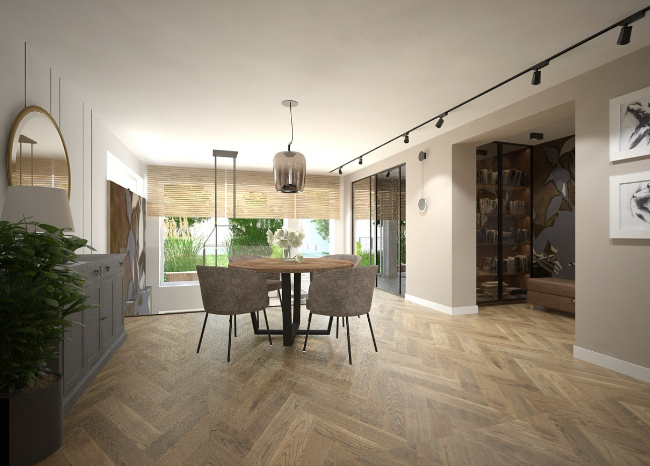 * zejście w dół do pokoju typu gabinet również z panoramicznymi oknami