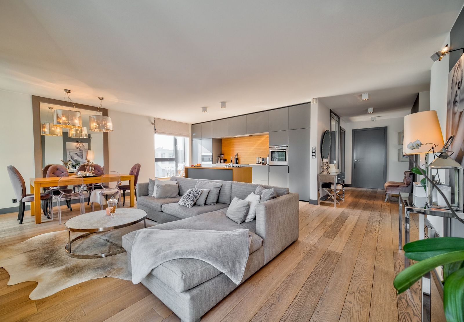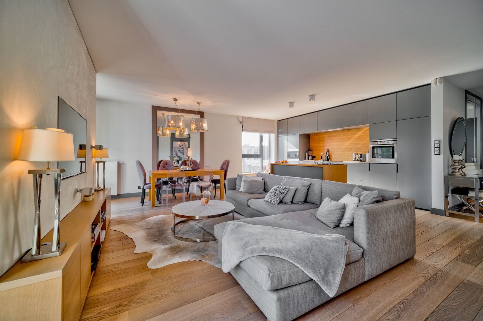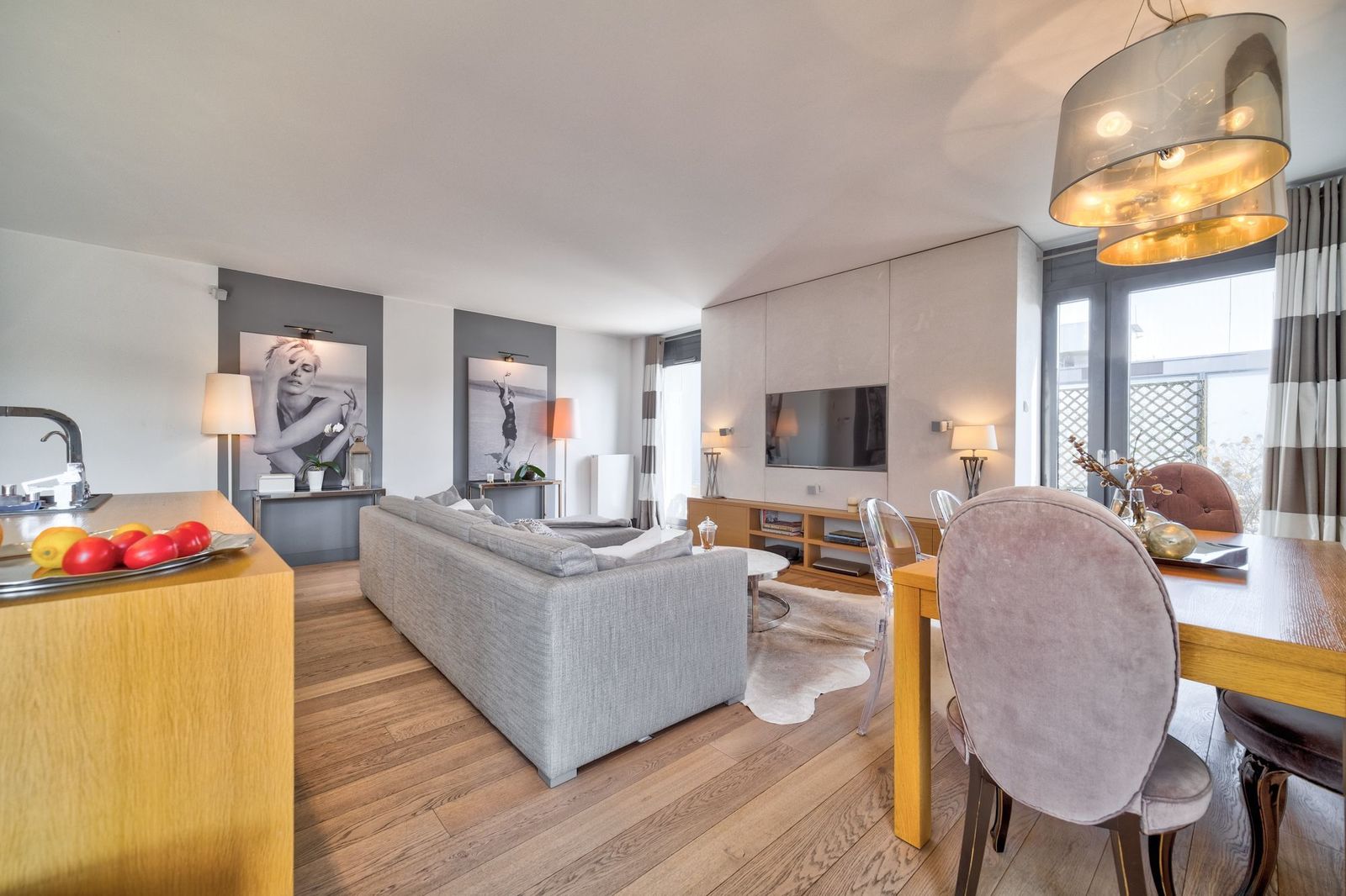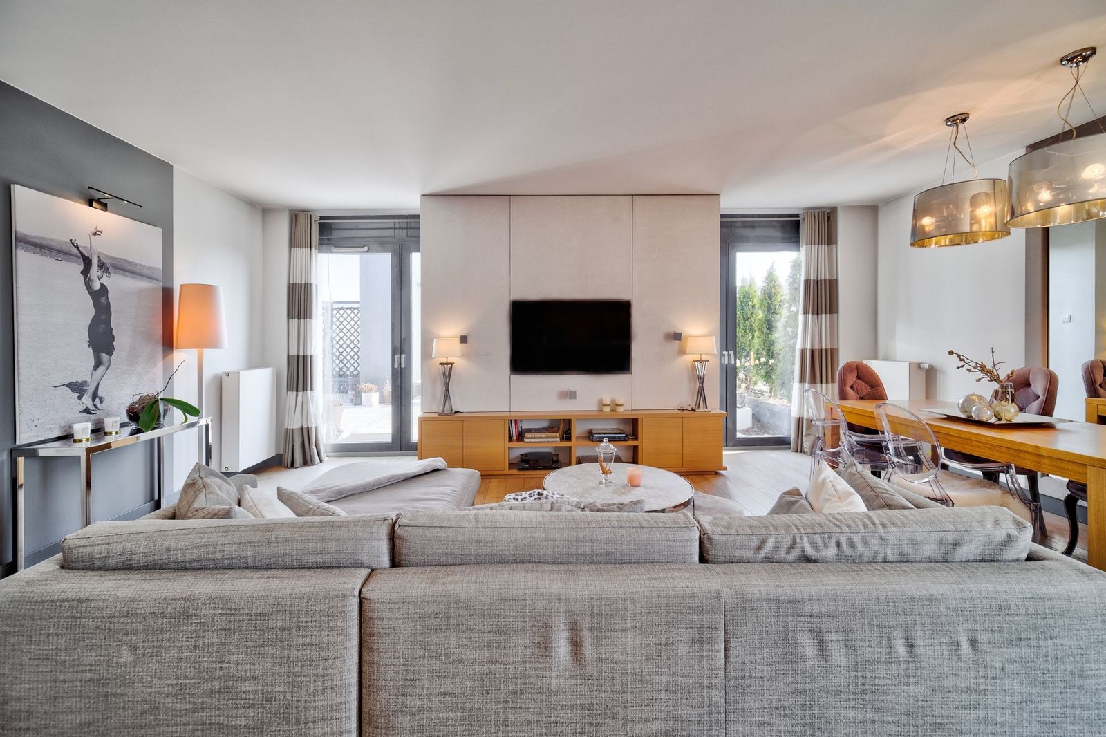 * duży salon z wypoczynkiem i stołem jadalnianym; z salony wyjście na duży taras