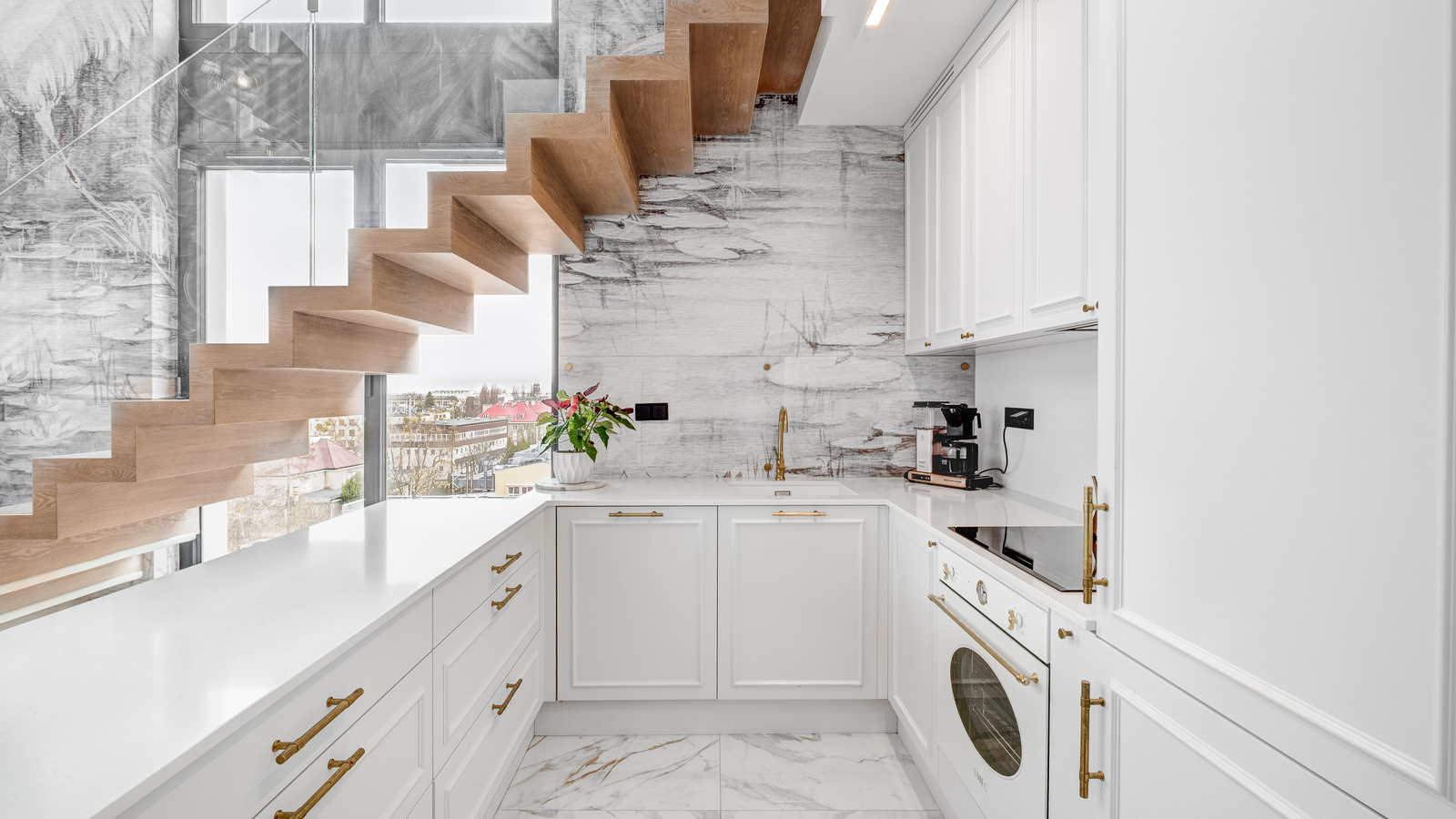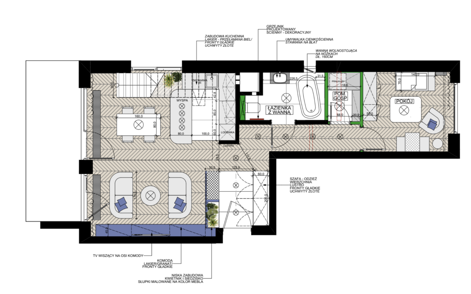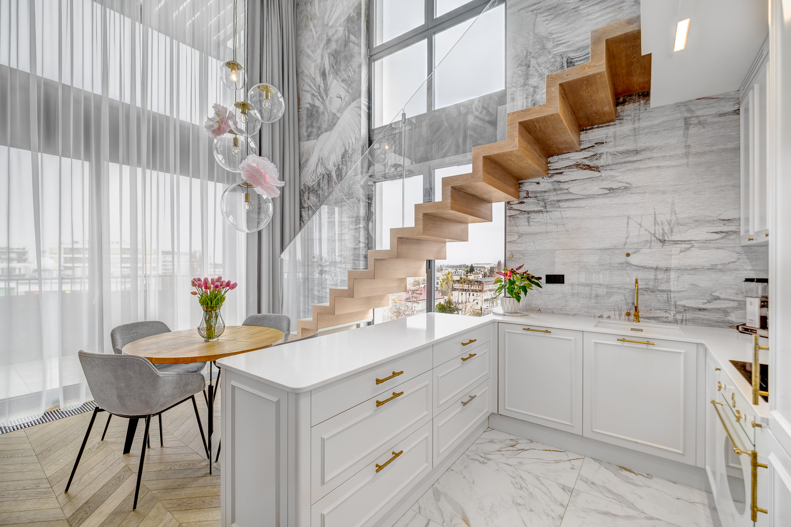 Wykończenie zostało zrobione z materiałów wysokiej jakości. Dobrej klasy sprzęty AGD – Smeg. Wysokość salonu – 5 metrów. Ekspozycja na trzy strony świata.