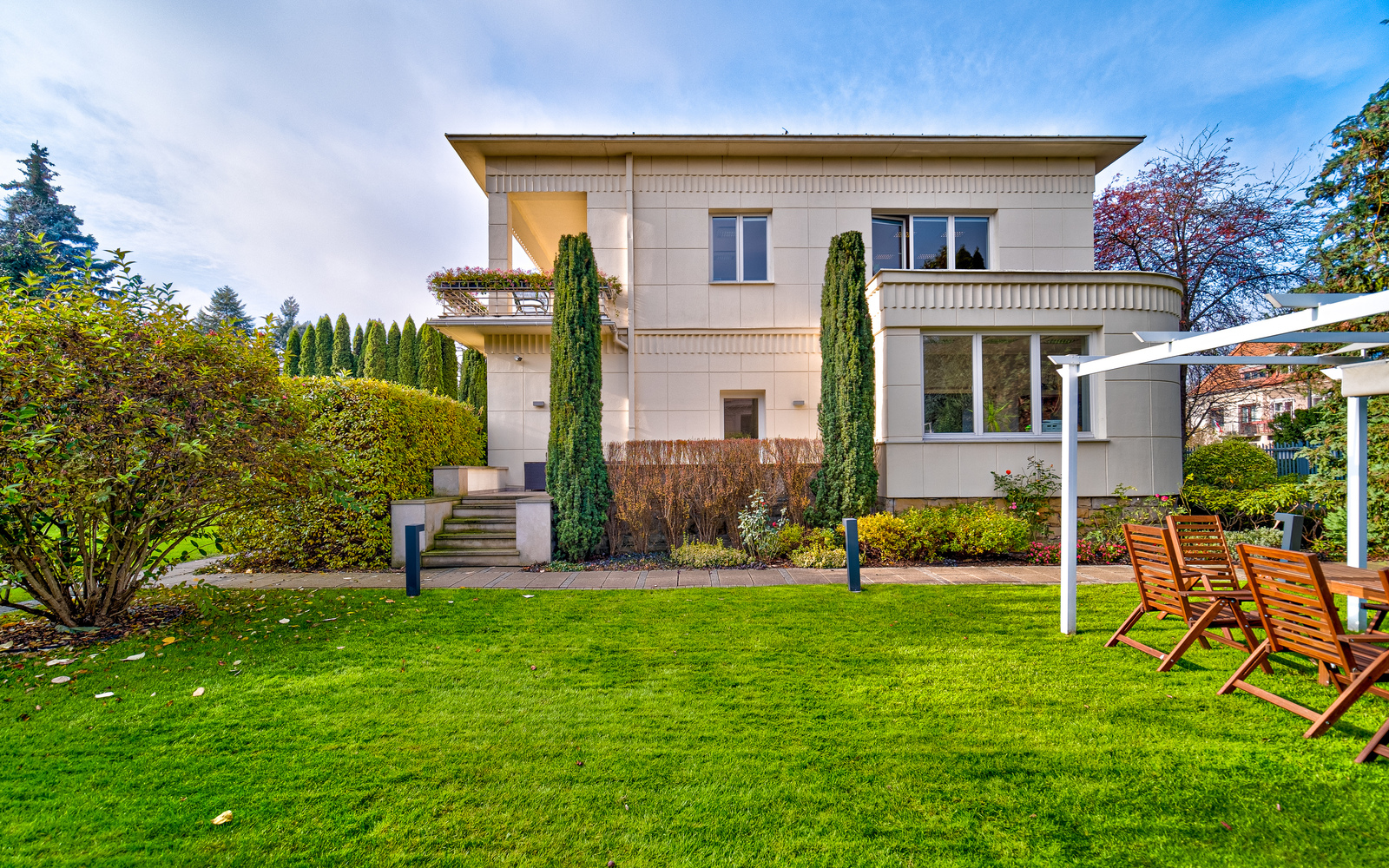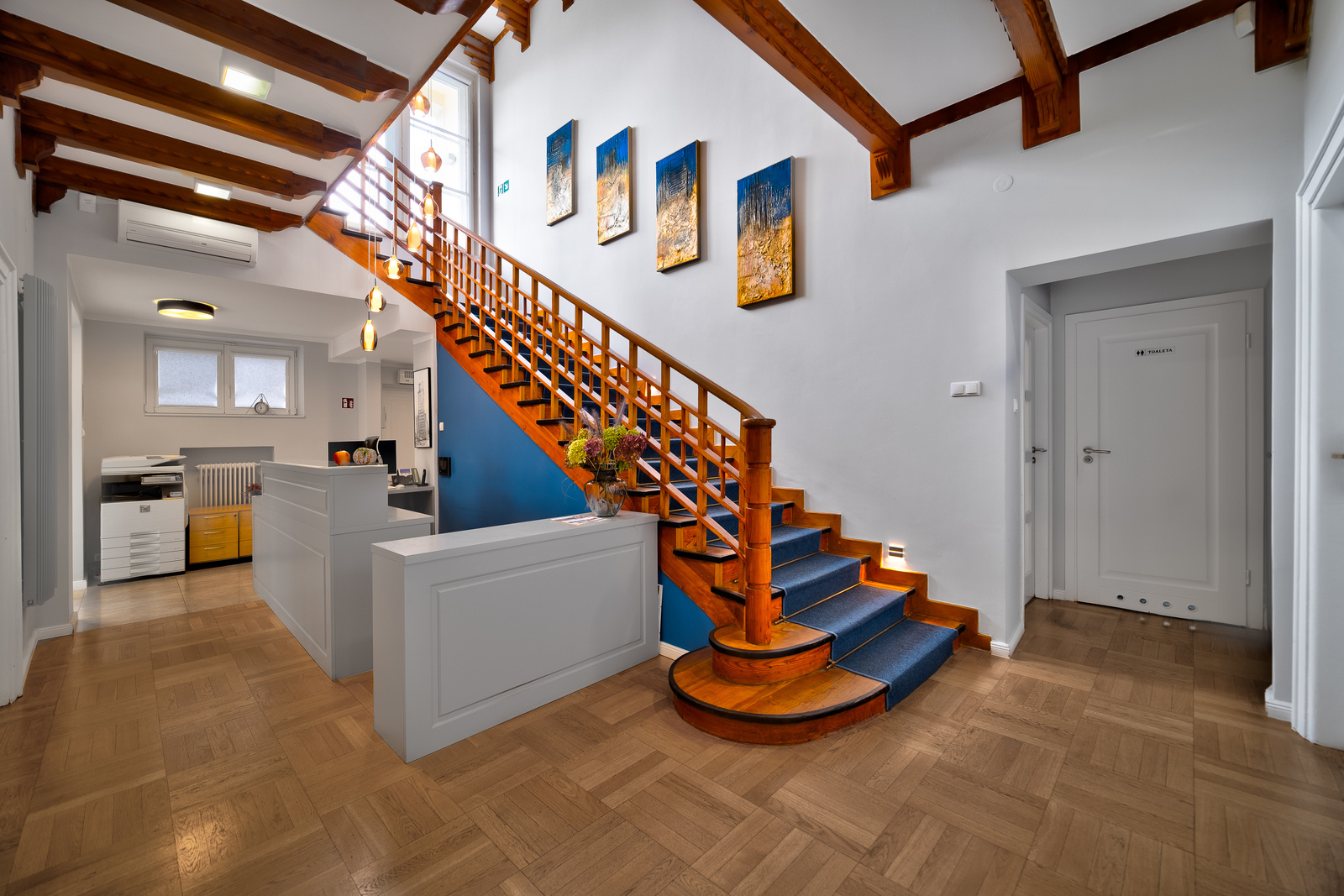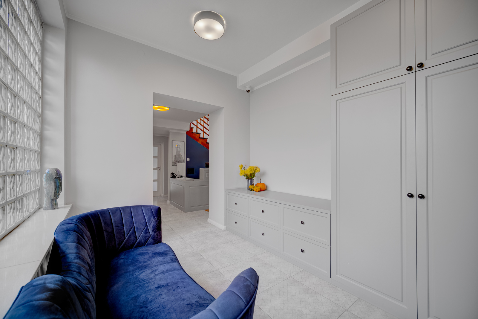 Bryła budynku modernistyczna, wewnątrz absolutnie wyjątkowe i unikatowe oryginalne schody i piękna dobrze doświetlona klatka schodowa. Przestronne i wysokie pomieszczenia oraz naturalnie wpadające światło to dodatkowy atut tej niezwykłej nieruchomości. Duże tarasy pozwalają cieszyć się zadbaną zielenią i widokiem na fantastyczny, bardzo zadbany i intymny ogród. Jest to idealna przestrzeń do relaksu w gorące letnie dni. Wnętrze zostało zaprojektowane i wykończone z dbałością o najdrobniejsze szczegóły i zadbano o każdy detal. Uwagę zwracają nie tylko wyjątkowe schody, ale również zachowane belki sufitowe oraz mozaikowe parkiety. Elegancka drewniana stolarka okienna oraz sztukateria to dodatkowe elementy na które warto zwrócić uwagę.