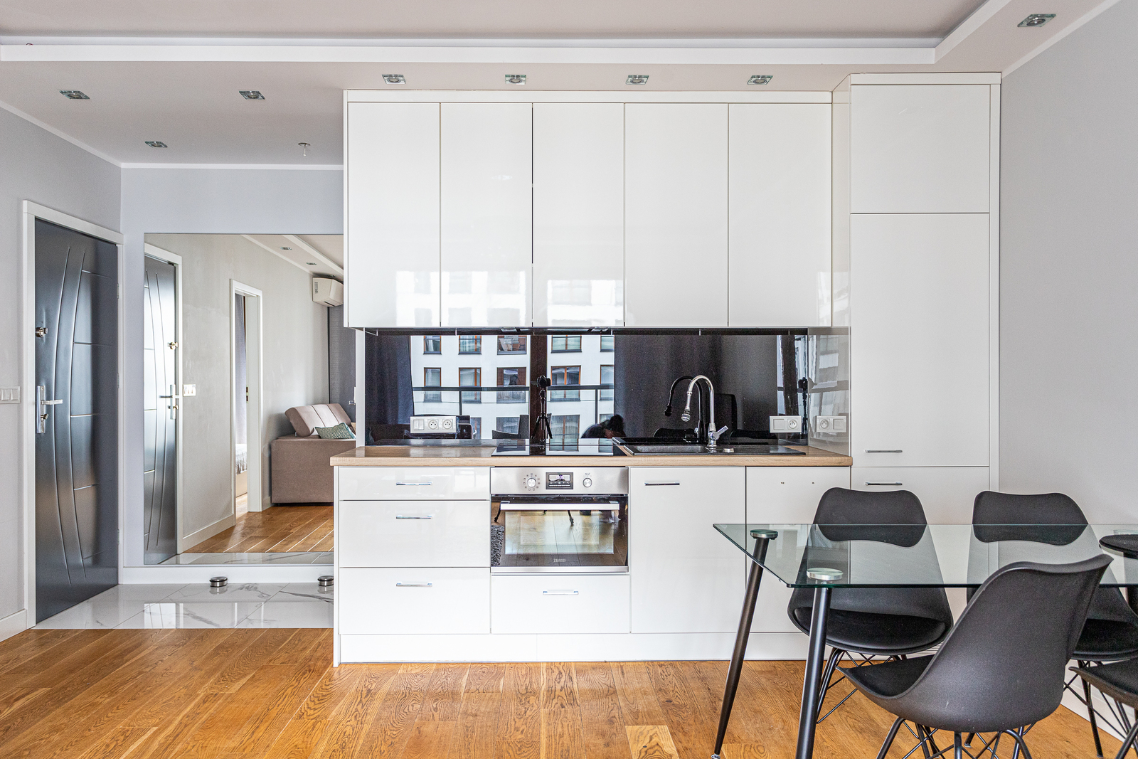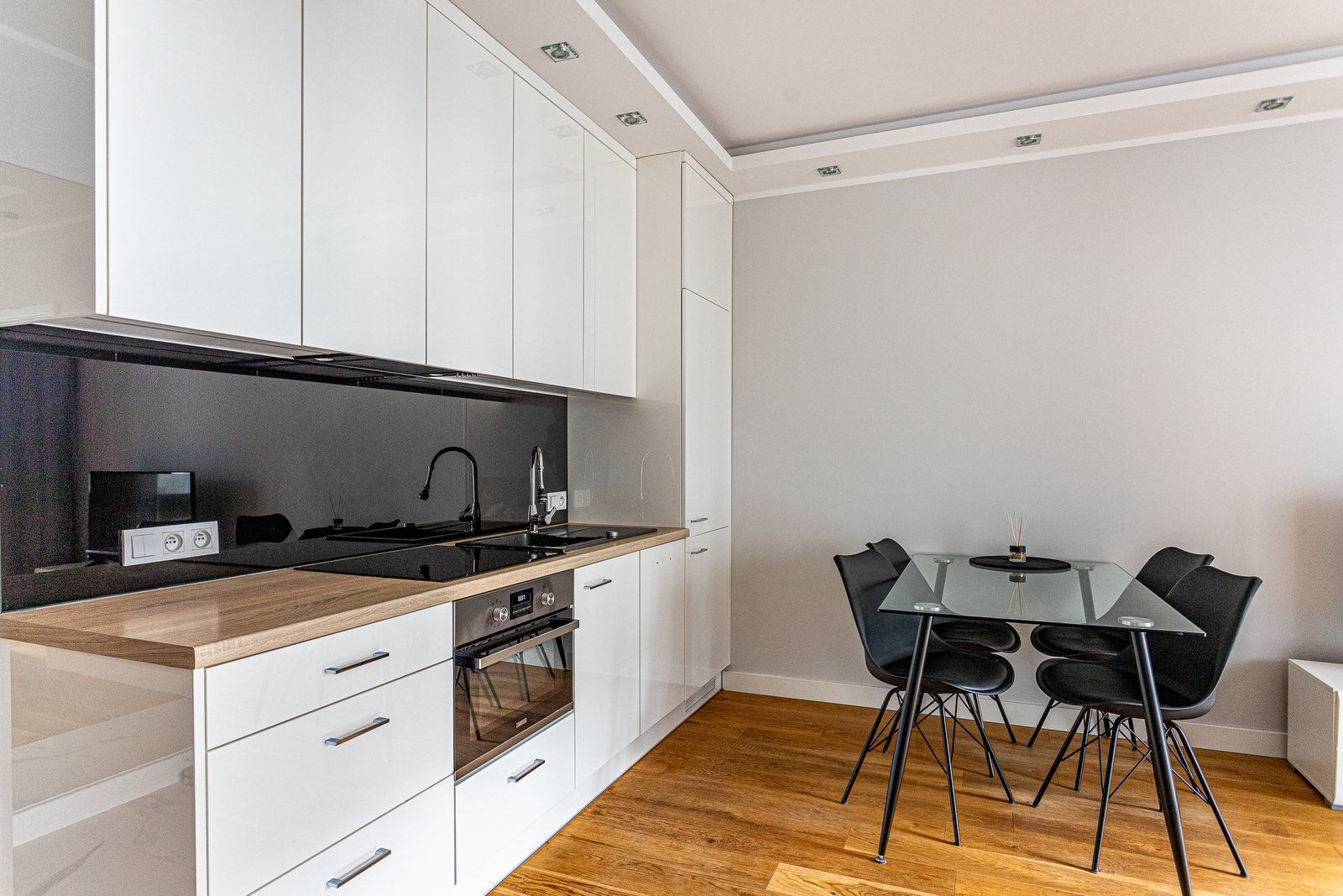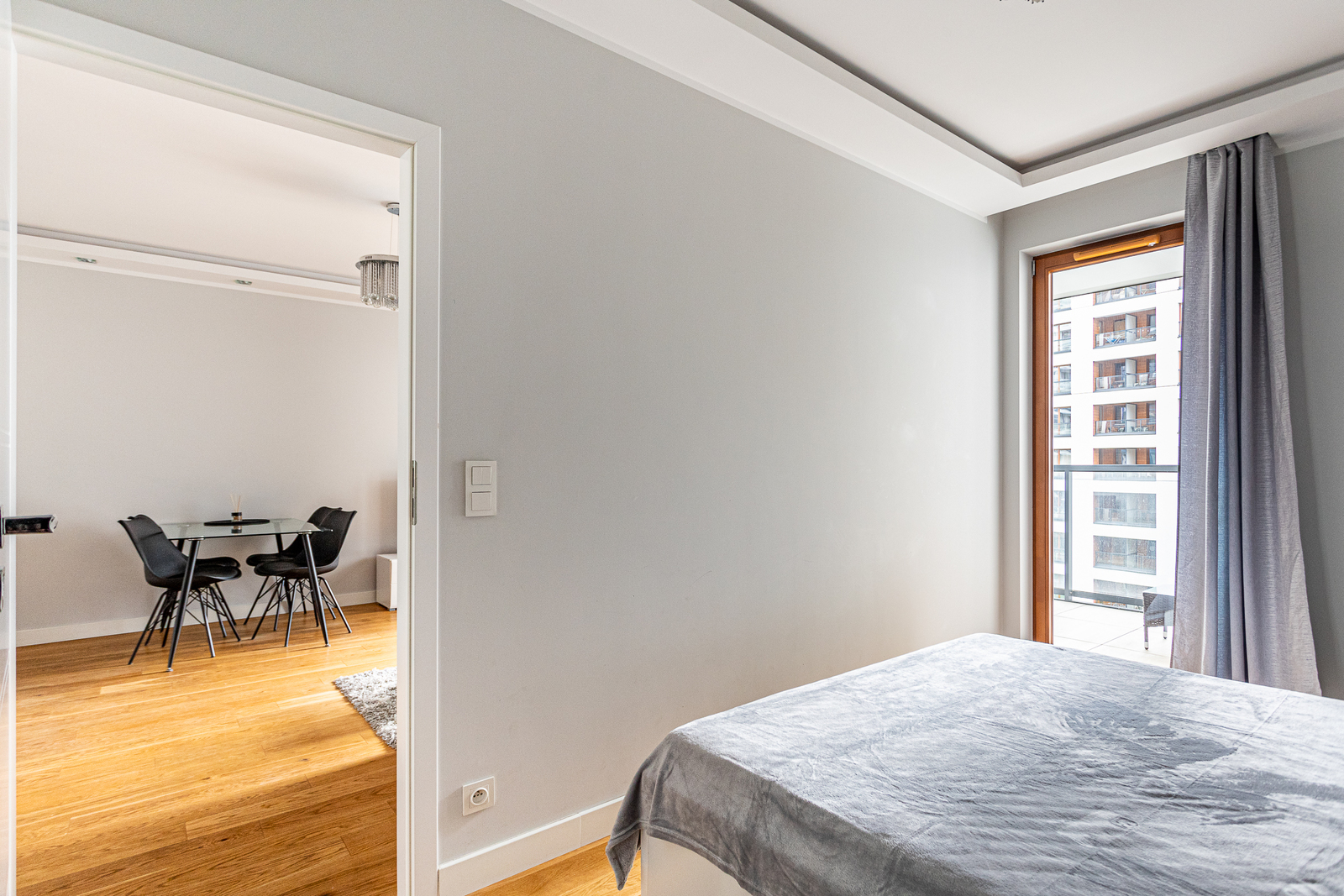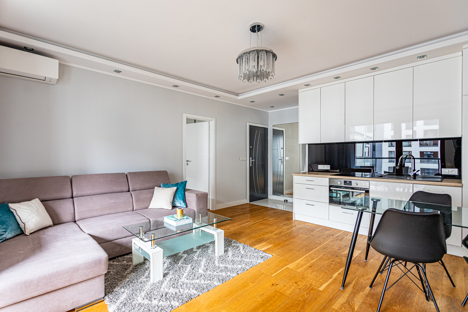 Mieszkanie jest klimatyzowane, zaprojektowane przez architekta z pełną starannością oraz dbałością o funkcjonalny układ mebli.