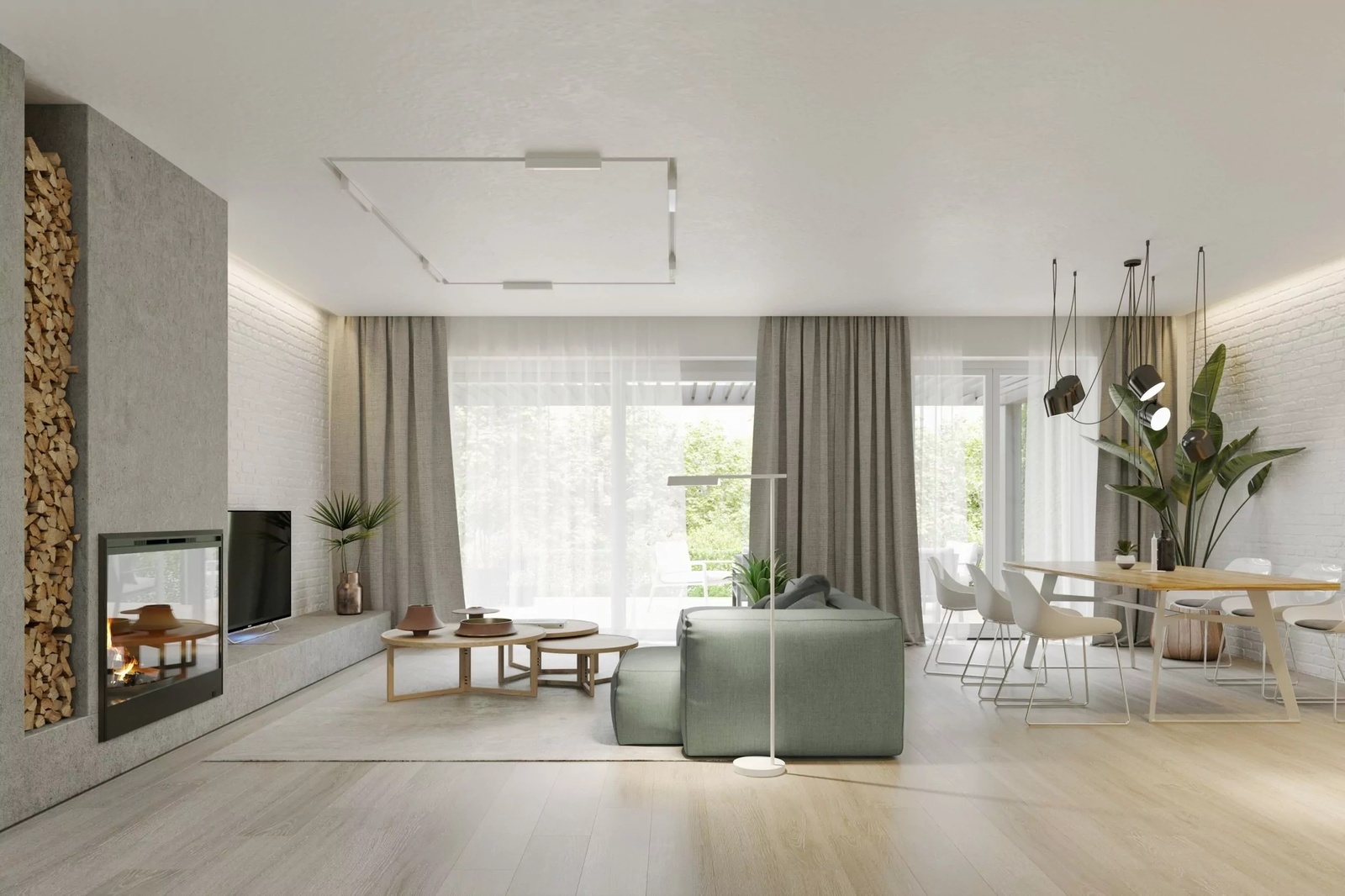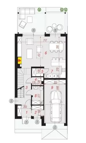 * salon z jadalnią oraz wyjściem na taras, ogród