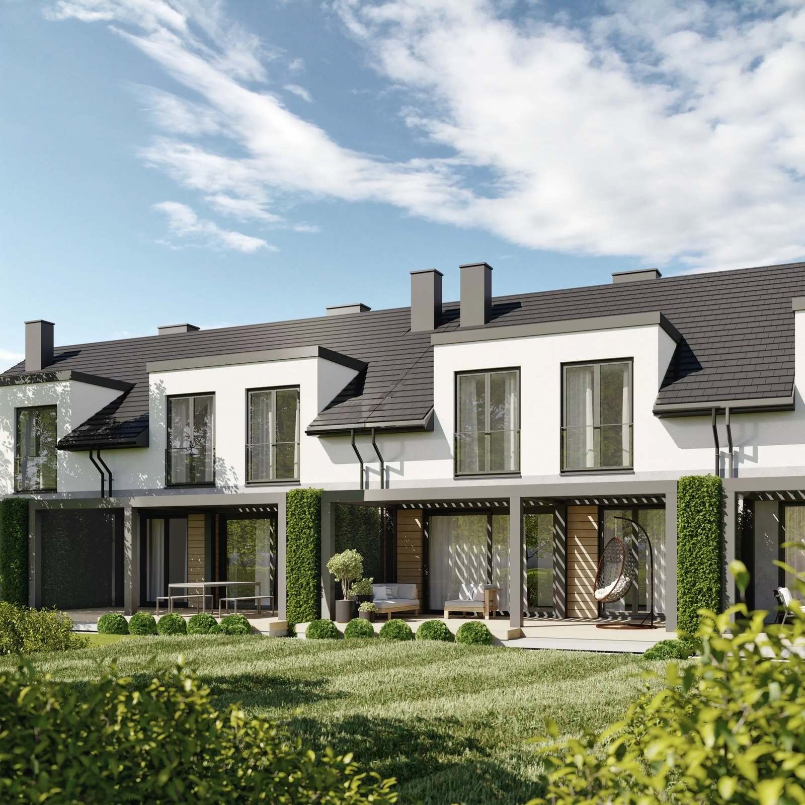 Inwestycja zbudowana jest z pełną starannością, z dbałością o wysoką jakość materiałów oraz o detale. Szczególną uwagę przykuwają wysokiej jakości duże panoramiczne okna z salonu wychodzące na taras, ogród.