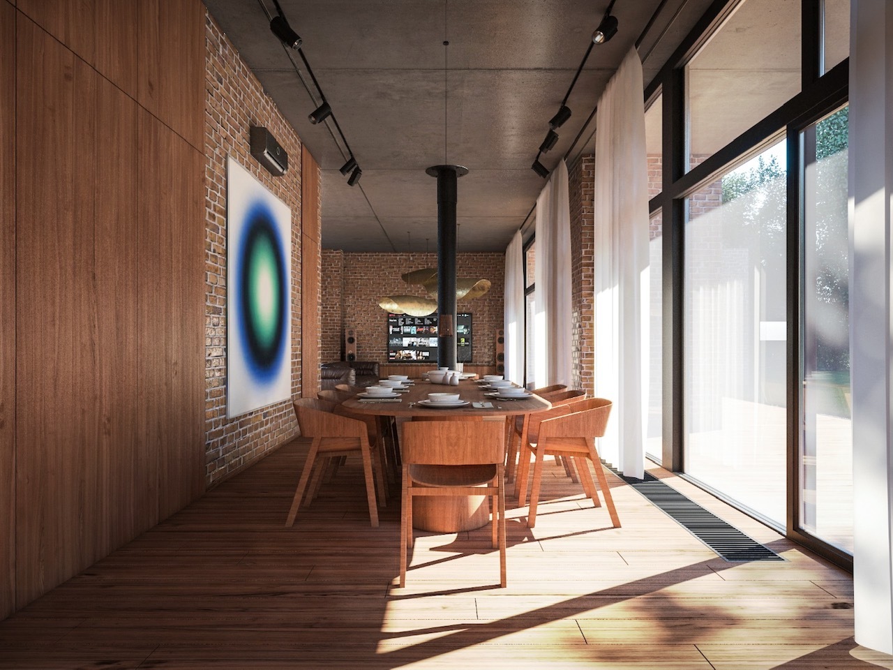 * wydzielona przestrzeń jadalniana z dużym stołem