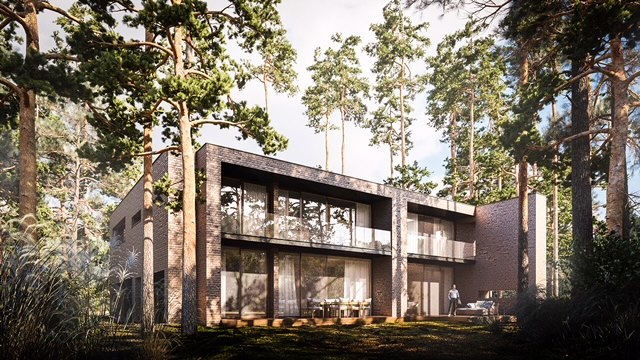 Duże panoramiczne okna definiują wnętrze nadając mu lekkości, a stylowewykończenie cegłą sprawia, ze dom wtapia się w sosnowy las. Dom jest nowy w trakcie prac wykończeniowych.