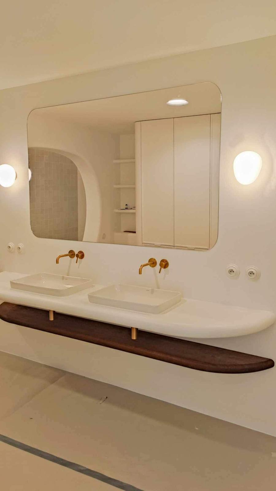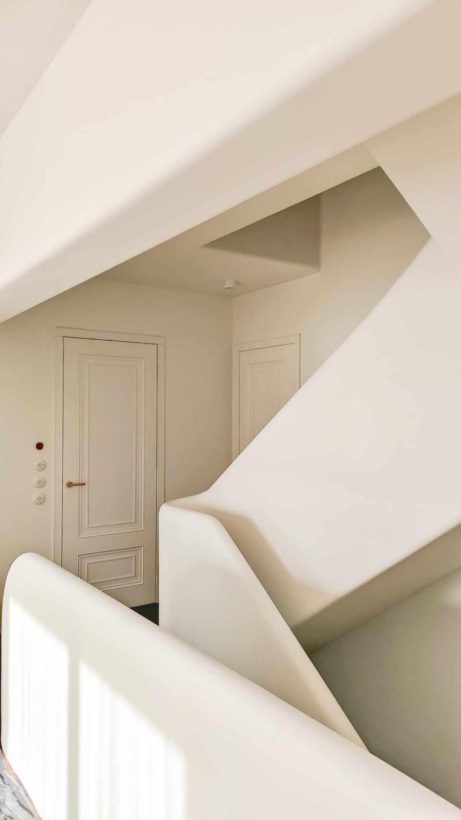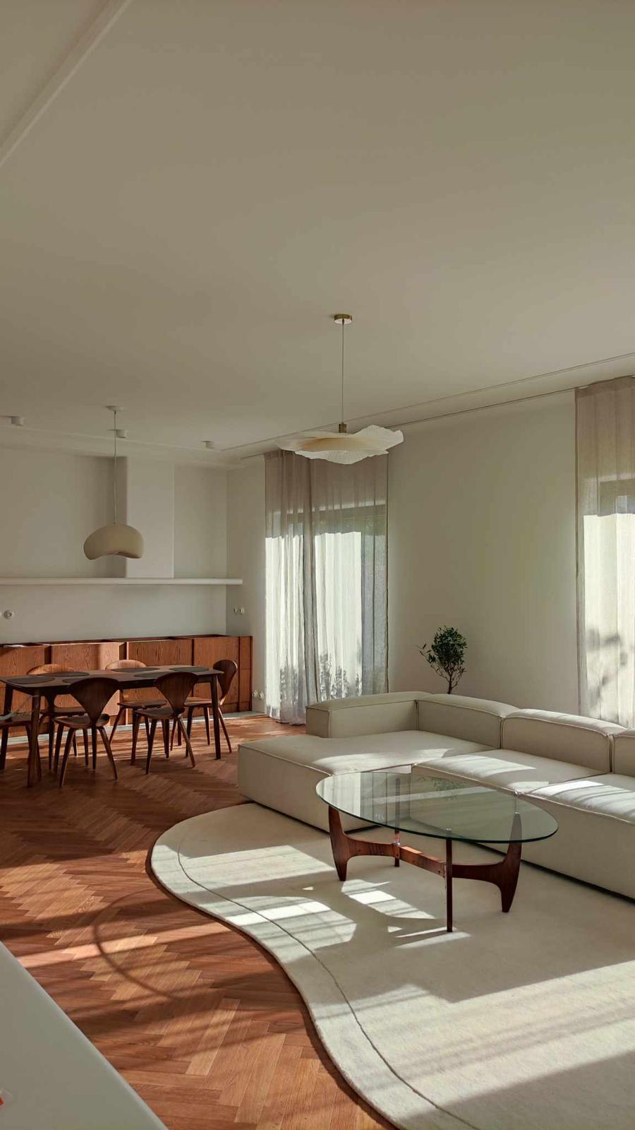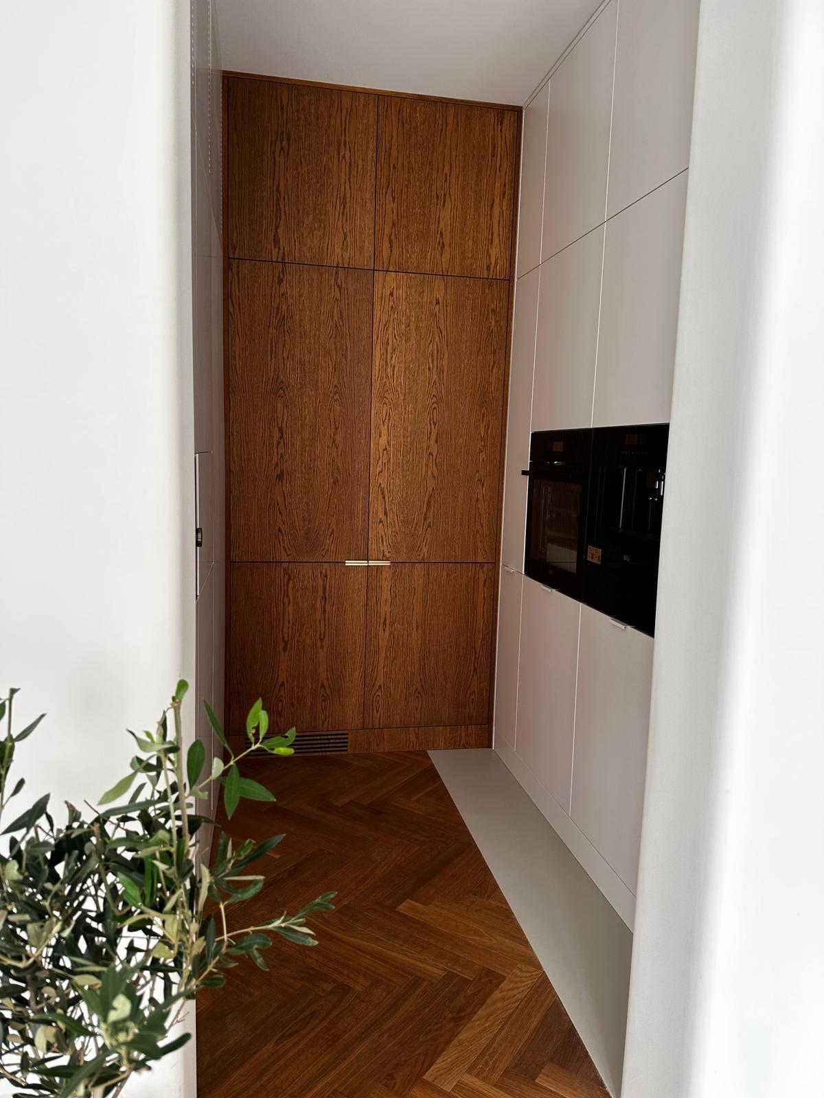 Niepowtarzany, minimalistyczny projekt. Absolutna dbałość o spójność koncepcji, niezwykle oryginalny, nawiązujący do stylu art deco, ale w nowoczesnym wydaniu. Do poszczególnych pomieszczeń na piętrze drzwi na zamówienie wykonane wg dedykowanego projektu nawiązujące estetyką do wnętrz paryskich kamienic z litej olchy. Klatka schodowa to każdy stopień z delikatnymi zaobleniami wykonanymi z wzmocnionego tynku oraz wysunięta stopnica drewniana z ukrytym delikatnym podświetleniem. Barierki klatki murowane wykończone zaobleniem. W łazience gościnnej i dziecięcej specjalne na zamówienie ręcznie formowane i wypalane płytki z matowym, perłowym wykończeniem. Gerebity w łazienkach obsługiwane za pomocą małego przycisku pneumatycznego. wszystkie półki samonośne wykonane ze specjalnej płyty wim platte osadzonej na kotwach chemicznych z dodatkowa konstrukcja wzmacniającą. Łazienki , podłoga w pralni, wiatrołapie, klatce schodowej, w pasie kuchni i na zapleczu wykonana z mikrocementu. Podłogi w pozostałych pomieszczeniach to renomowanej firmy kaczkan parkiet warstwowo barwiony thermo, szczotkowany i wykończony olejowoskiem. Najwyższej jakości sprzęty ( lodówka, mikrofalówka, kawiarka, szuflada grzewcza, zmywarka, pralka, suszarka). Porcelanowe kontakty retro. Grzejniki IRSAP.