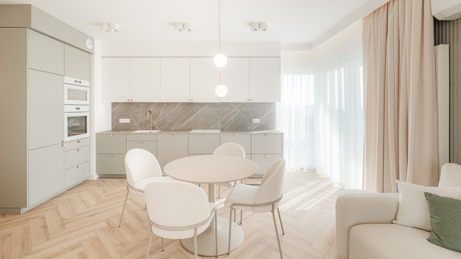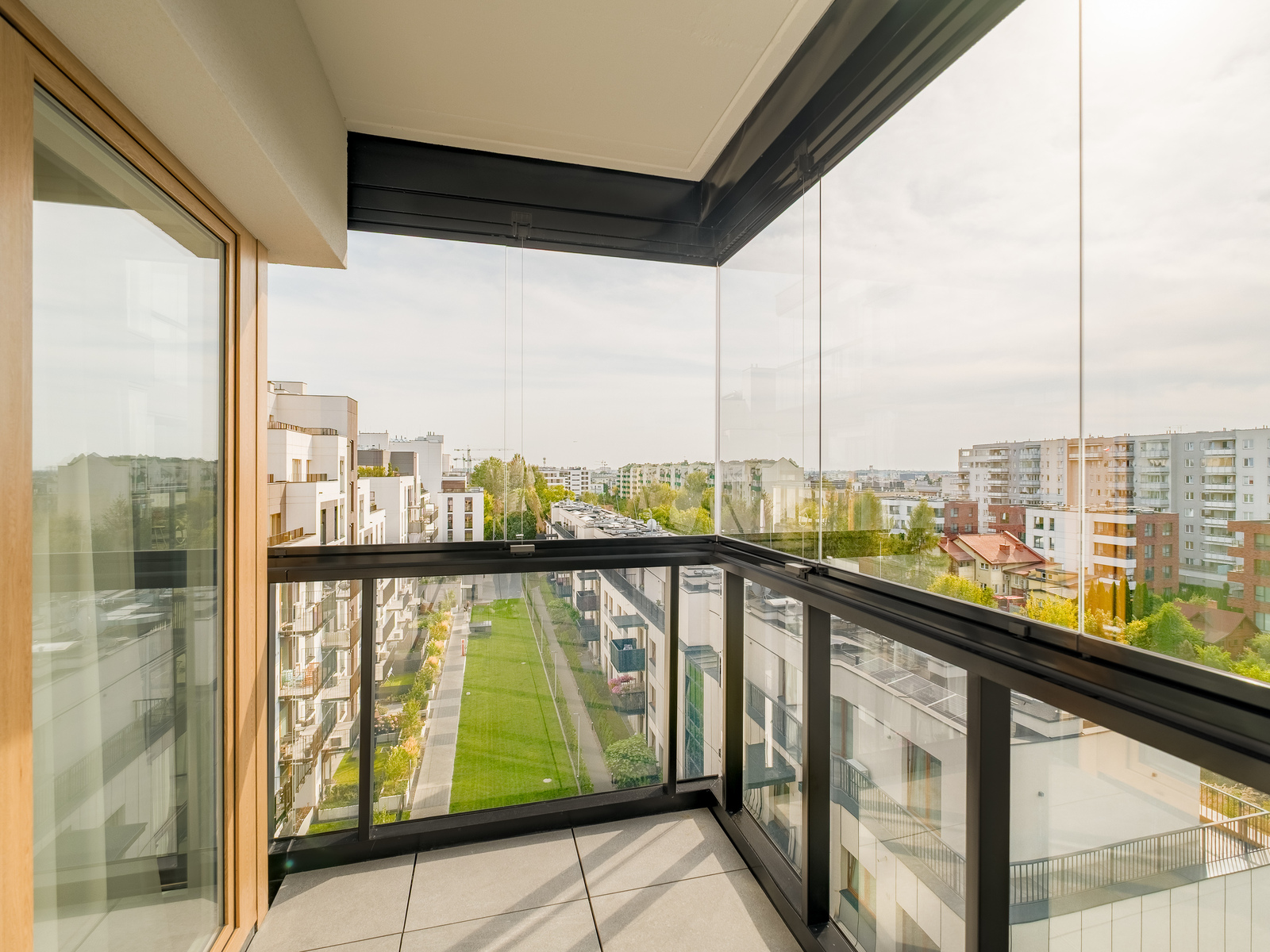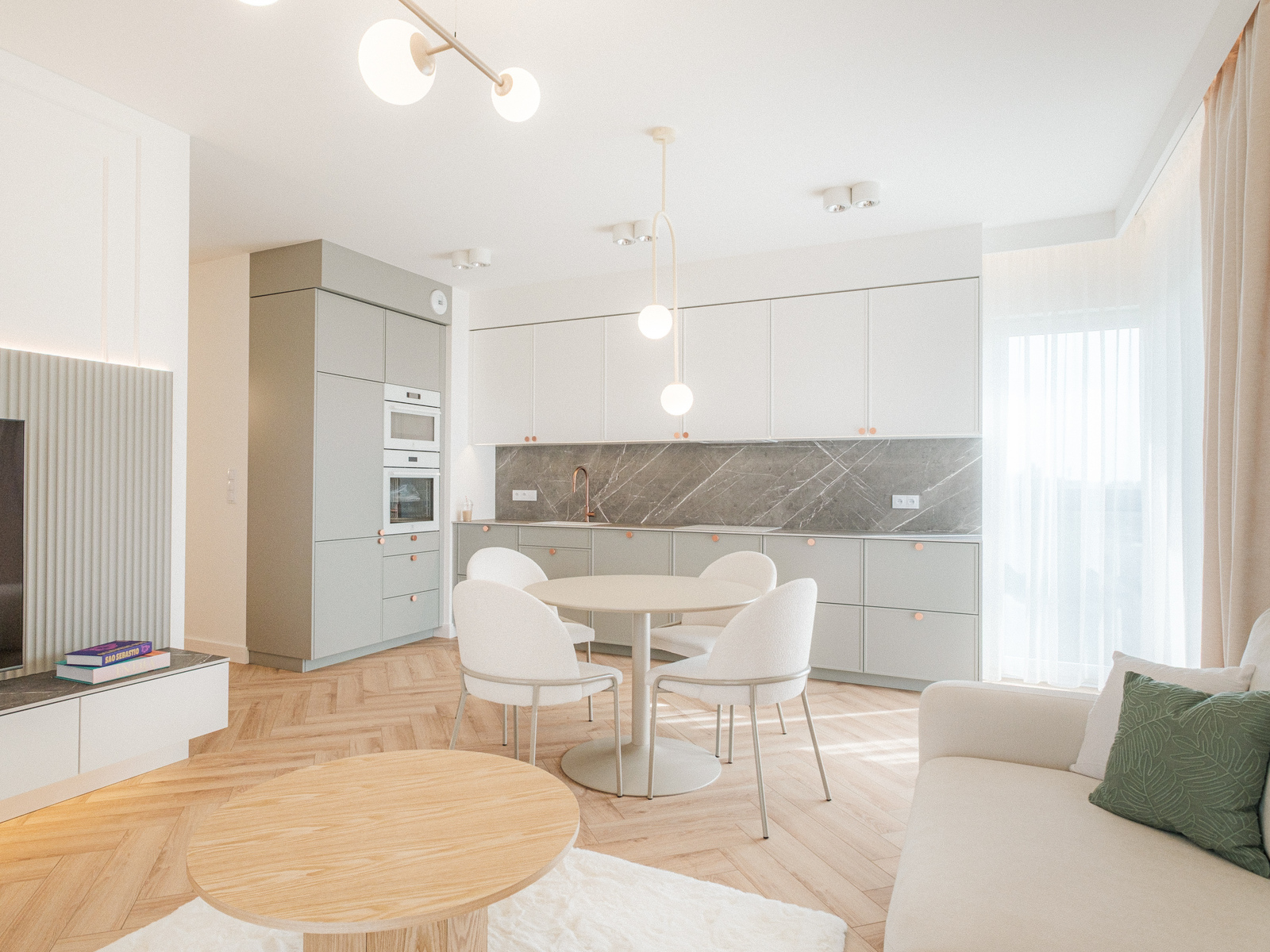 * Salonu z aneksem kuchennym oraz wyjściem na balkon, który roztacza się dookoła całego apartamentu (30 m2 loggi)