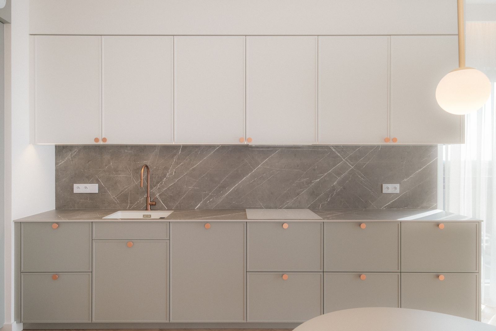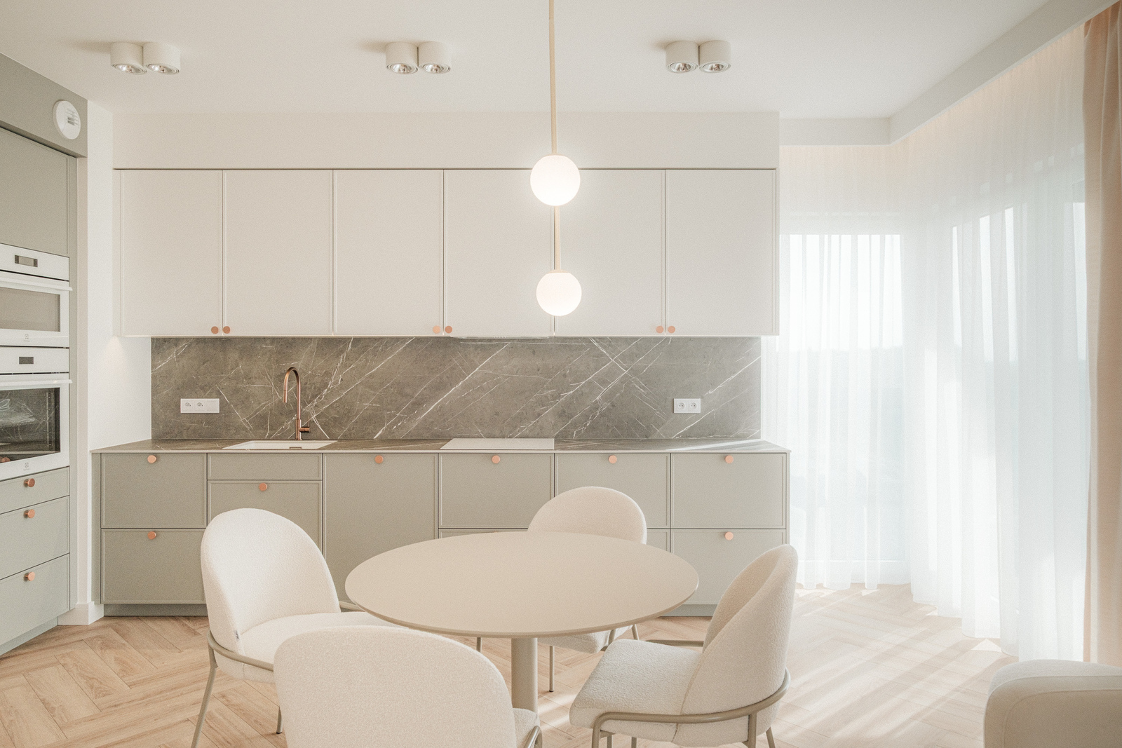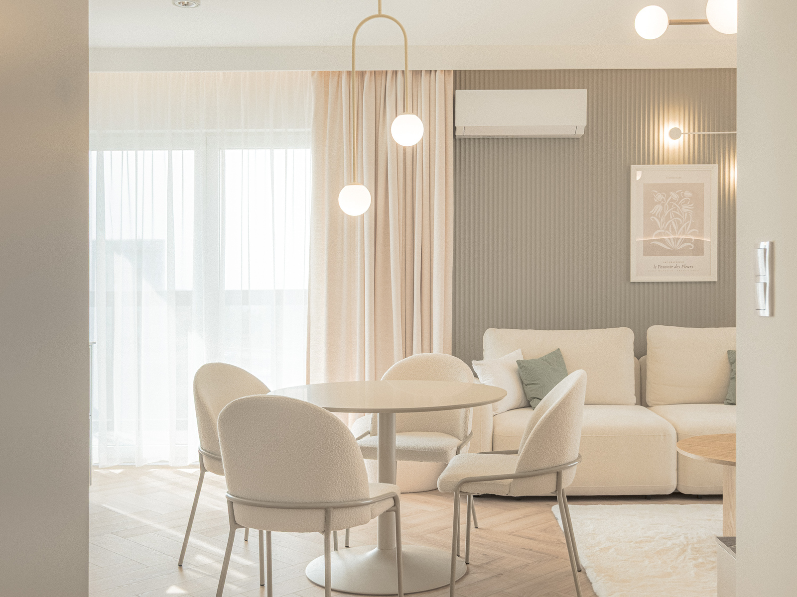 * Salonu z aneksem kuchennym oraz wyjściem na balkon, który roztacza się dookoła całego apartamentu (30 m2 loggi)