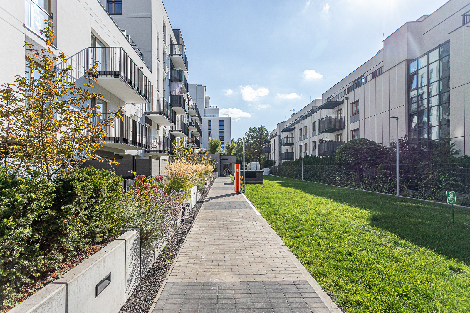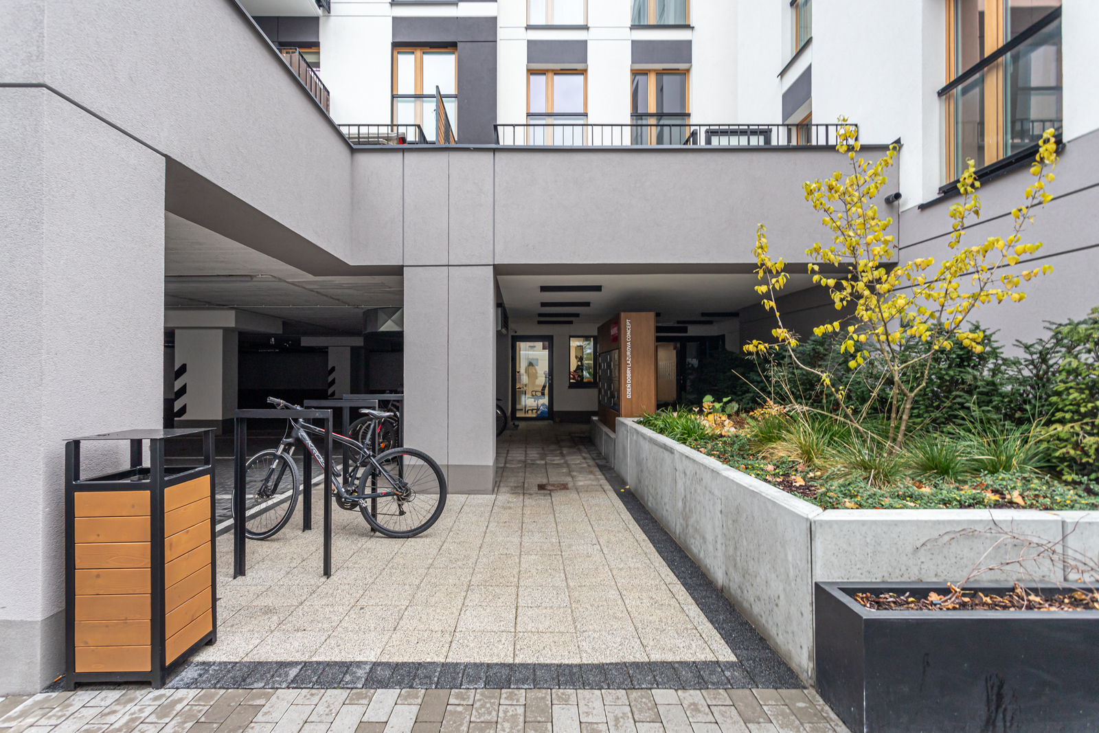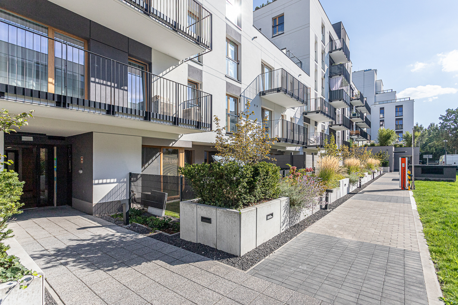 Przed budynkiem (dla mieszkańców) znajduje się patio zaprojektowane zarówno pod kątem dzieci jak i dorosłych ze strefą relaksu.