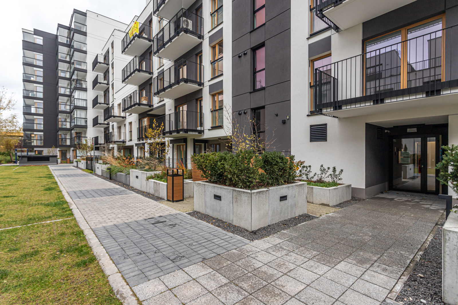 Przed budynkiem (dla mieszkańców) znajduje się patio zaprojektowane zarówno pod kątem dzieci jak i dorosłych ze strefą relaksu.