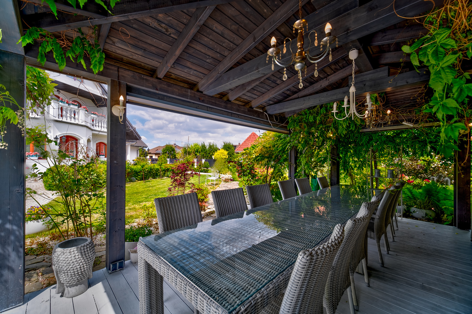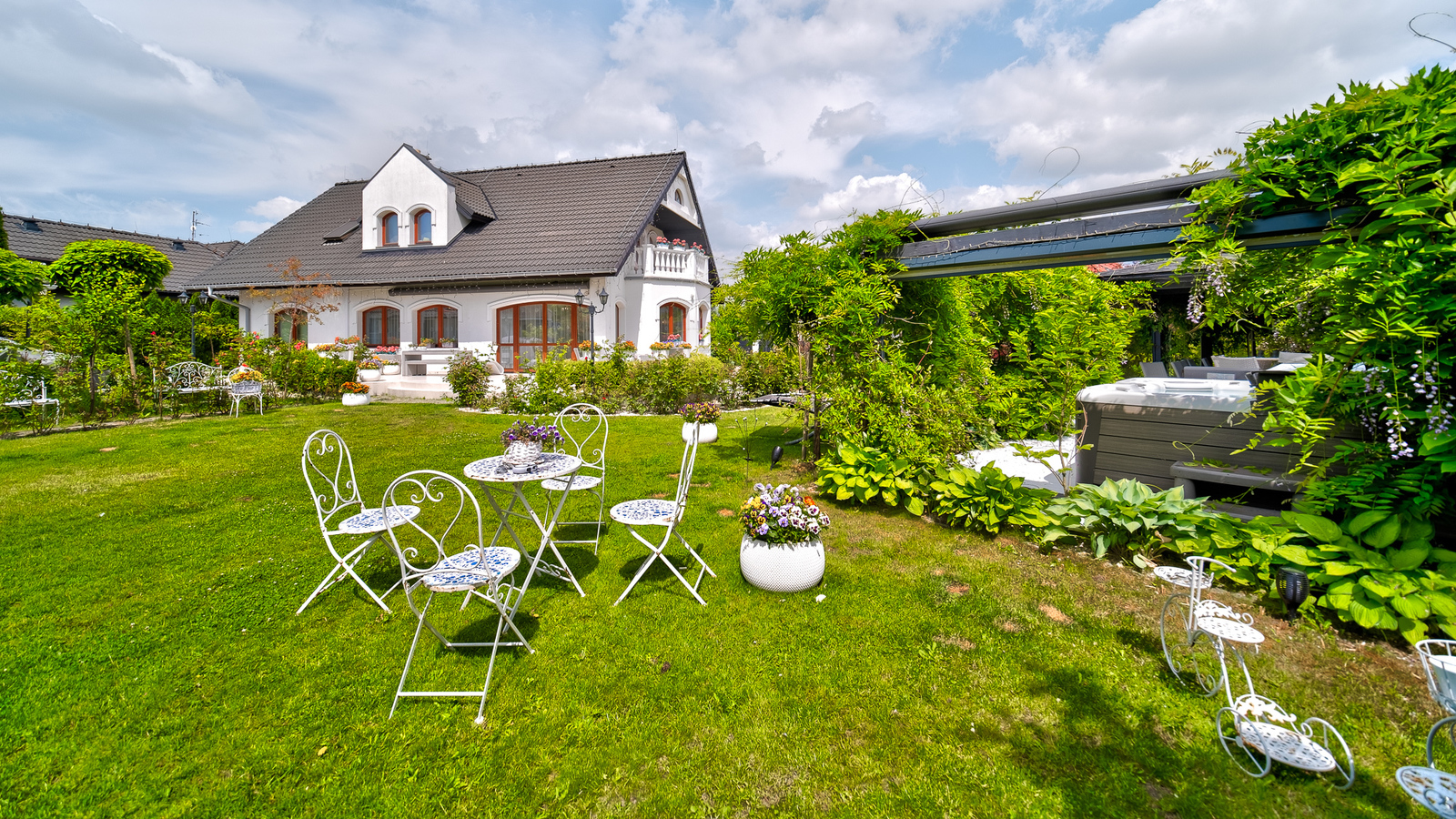 Piękny zadbany przez ogrodników ogród z altana na imprezy, grilla. Jacuzzi w ogrodzie.