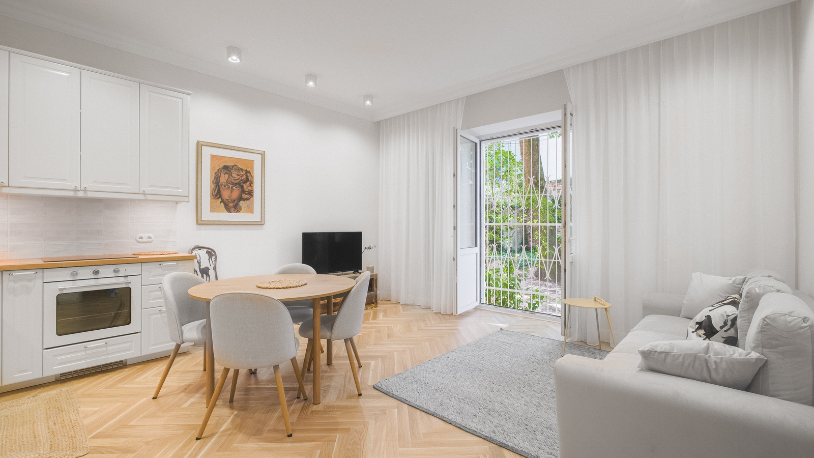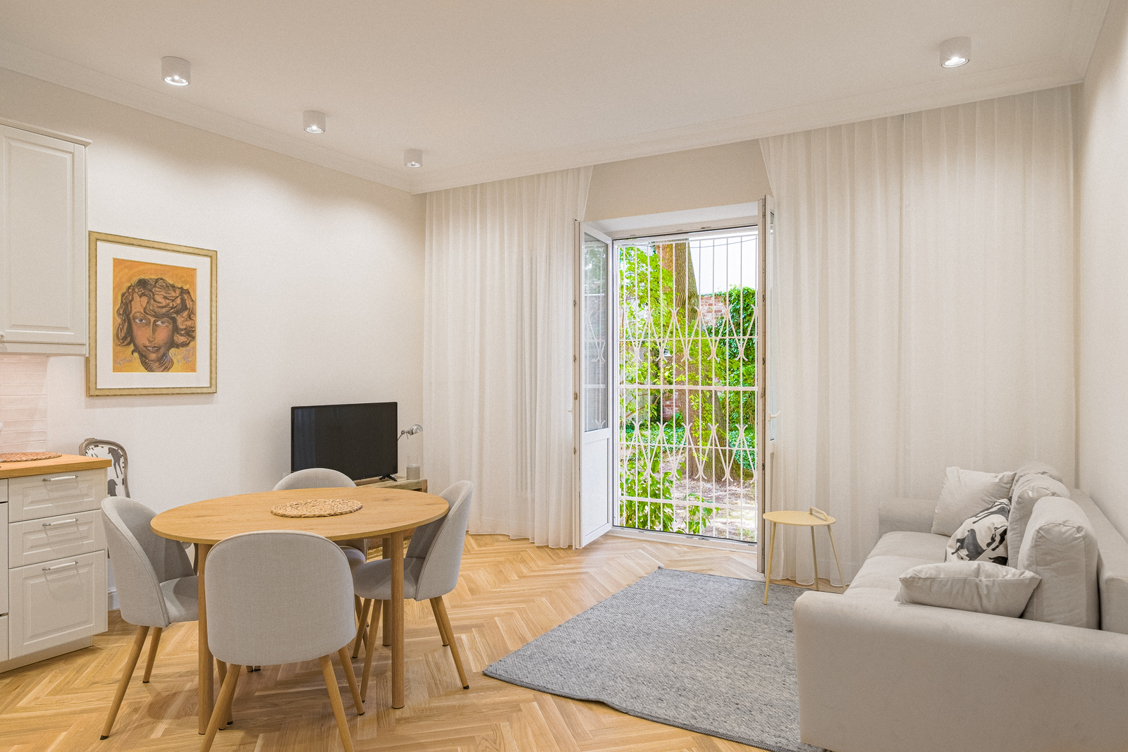 Apartament posiada wyjście na zielony ogródek – patio, idealny dla właścicieli czworonogów. Jest w pełni wyposażony i ładnie umeblowany.