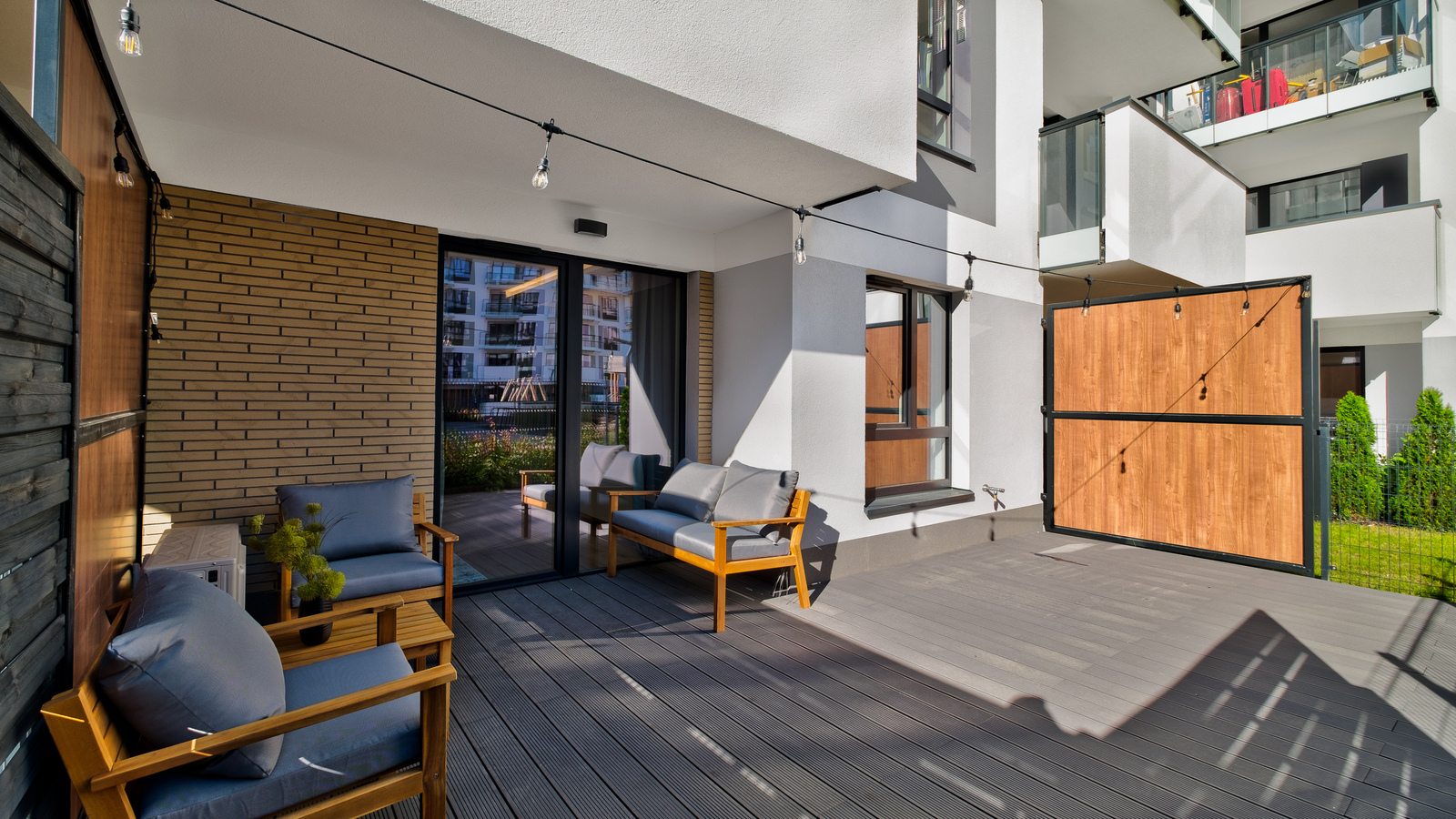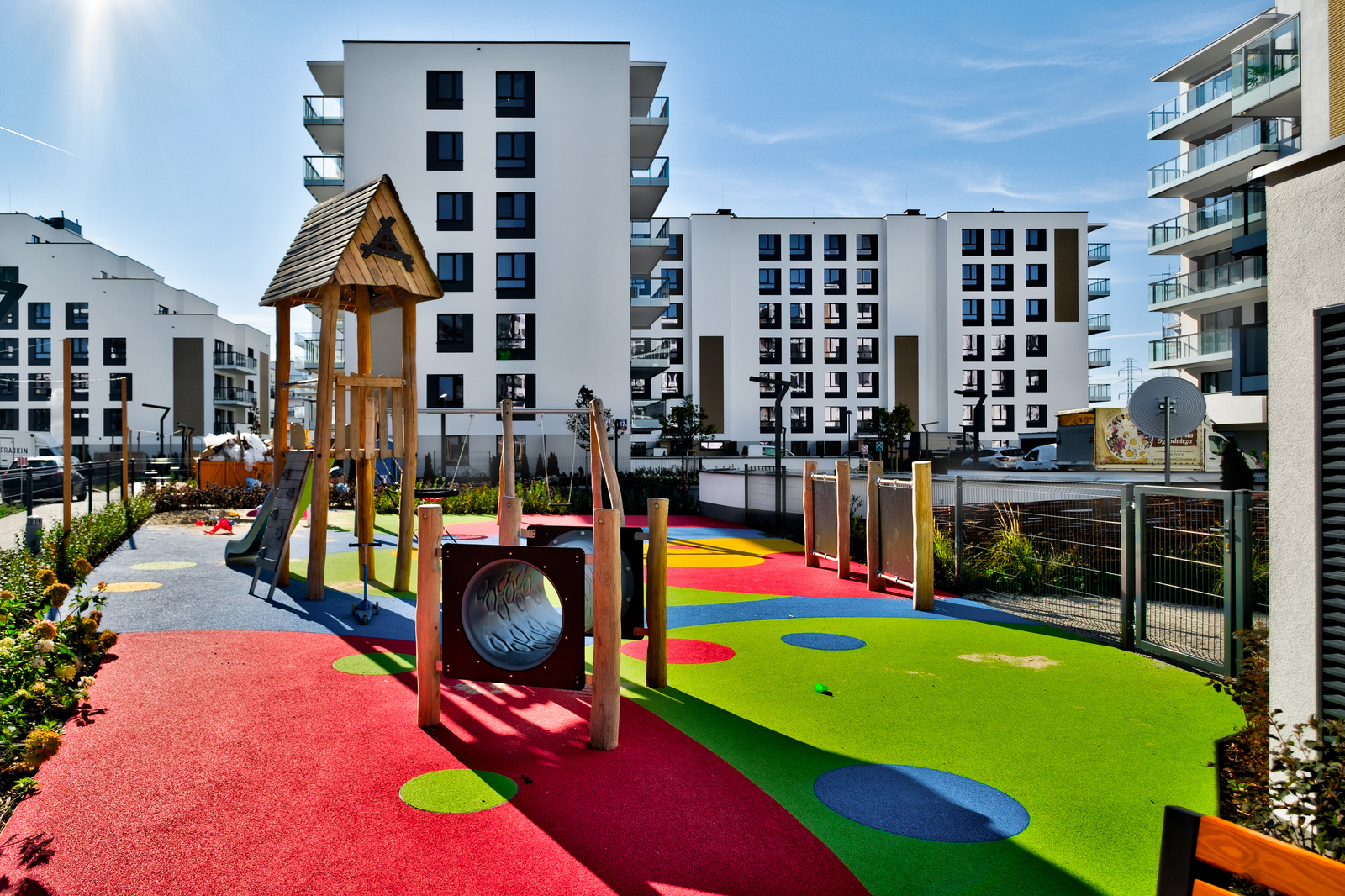 Przed budynkiem (dla mieszkańców) znajduje się patio zaprojektowane zarówno pod kątem dzieci jak i dorosłych ze strefą relaksu.