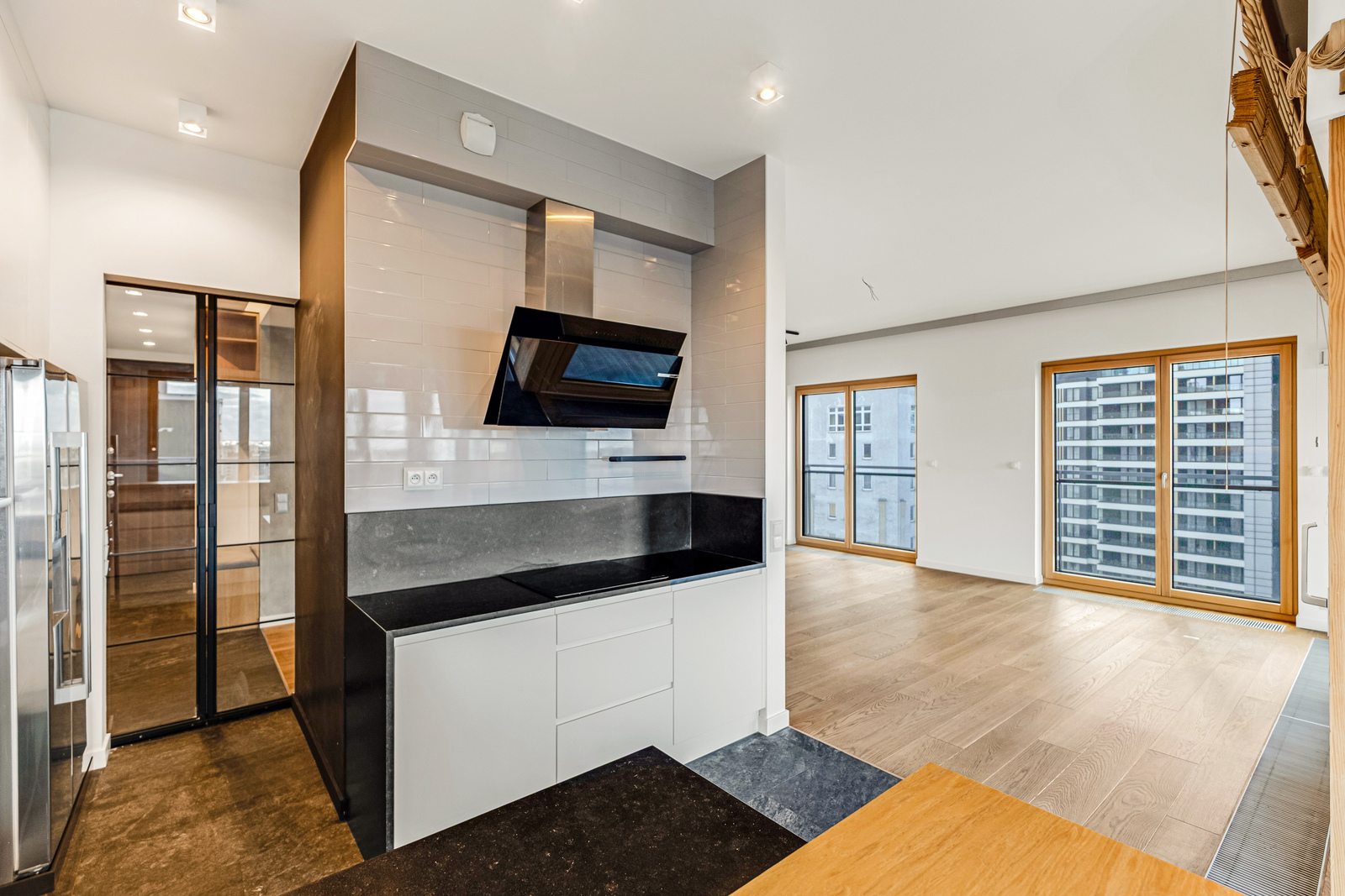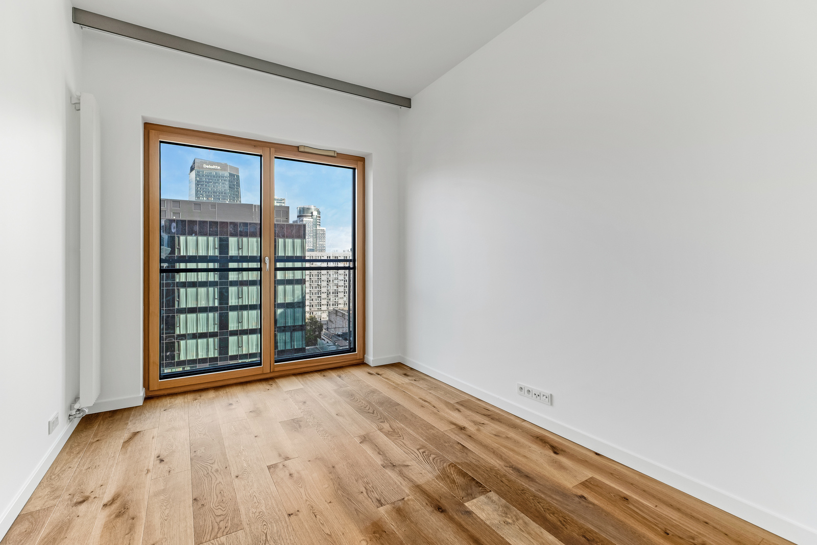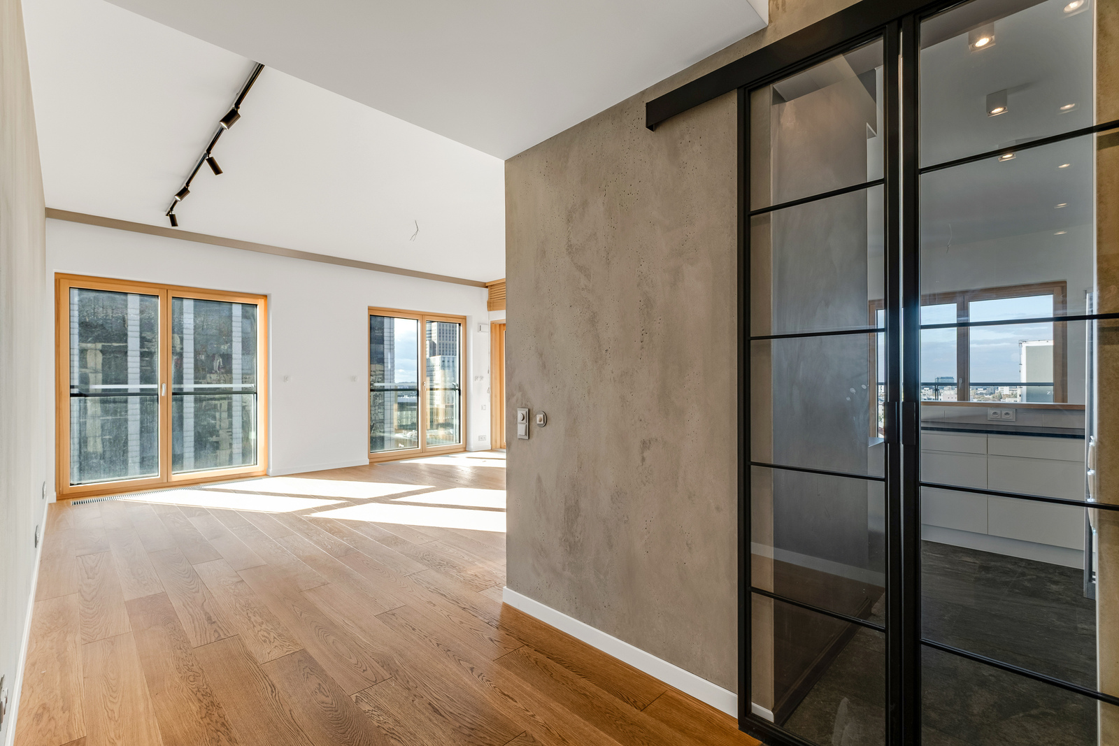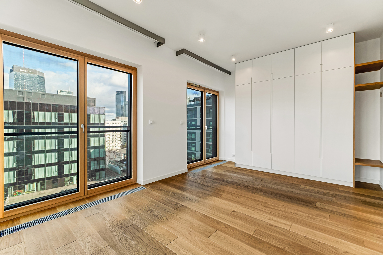 Apartament znajduje się na jednym z dwóch ostatnich pięter wieży, co zapewnia ponadstandardową wysokość pomieszczeń (powyżej 3 metrów) oraz fabryczną preinstalację klimatyzacji. To rzadka cecha w Mennica Residence, która znacząco zwiększa poczucie przestrzeni i prestiżu.